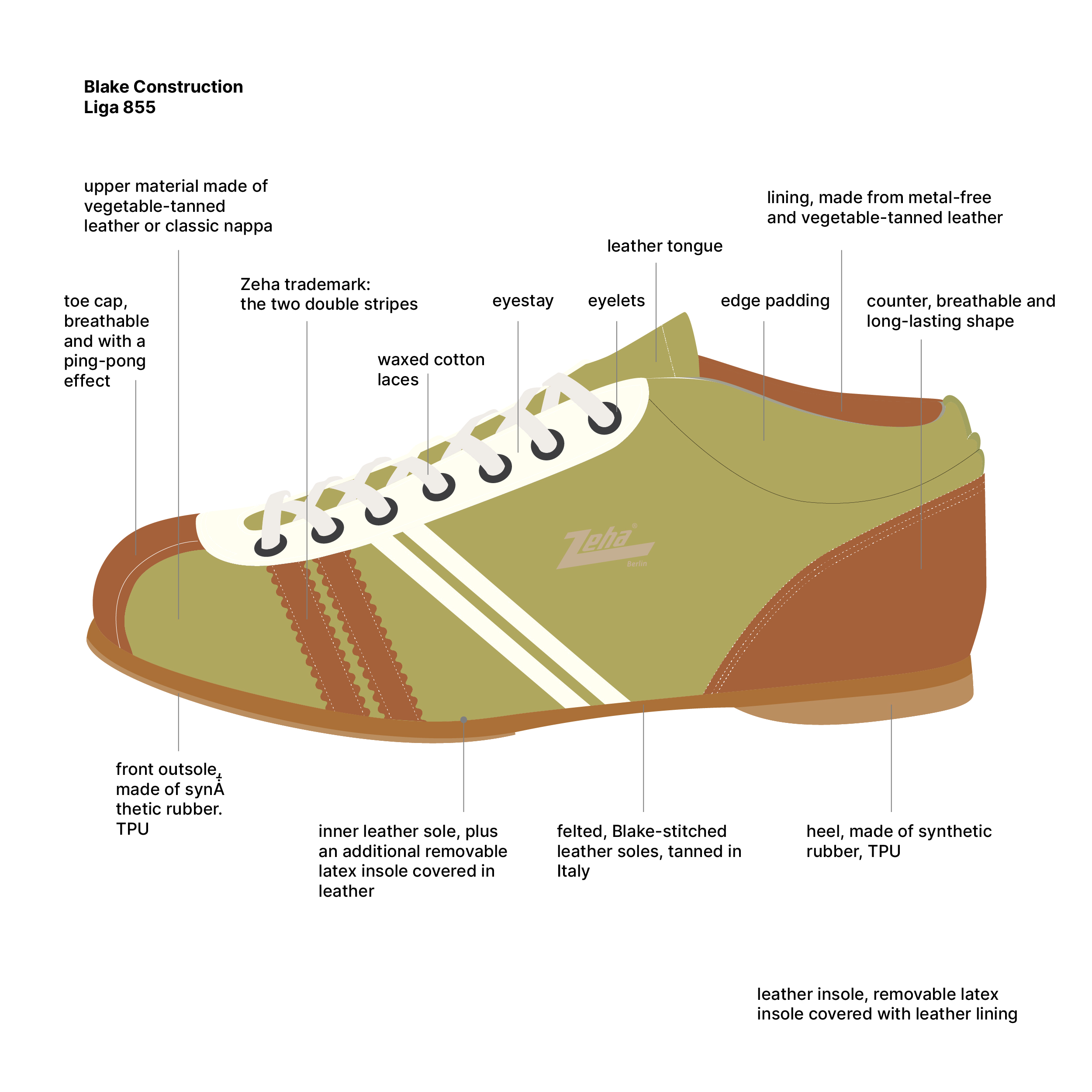 Zeha Berlin shoes are made of high-quality material. To ensure you can enjoy your new shoes for a long time, care instructions are included with every shoe box. Please read them carefully. Complaints resulting from improper care of the material cannot be accepted.