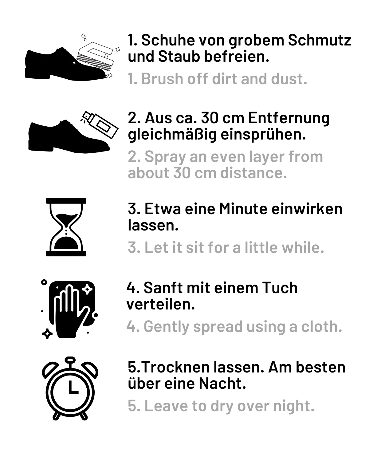 Vorgehen: Staub und Schmutz entfernen. Materialverträglichkeit an unauffälliger Stelle testen, schließlich Bekleidung, Schuhe oder Equipment aus mind. 30 cm Entfernung gleichmäßig einsprühen. Achtung: nicht durchnässen und ggf. Emulsion nach Einwirken mit Tuch einreiben.