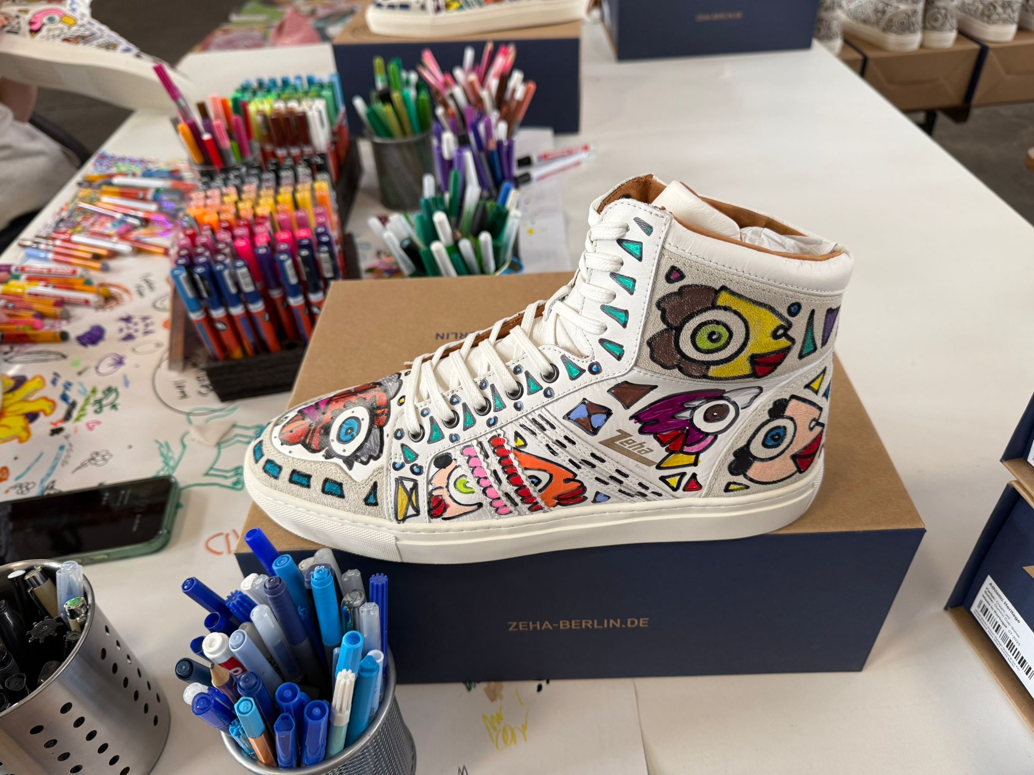 Die 300 handbemalten Basketballer vereinen ZEHA-Tradition mit der unverwechselbaren Bildsprache von Michael Fischer-Art. Jedes Paar wird einzeln gestaltet und erhält seine eigene Identität, die den Schuh zu einem besonderen Objekt mit Charakter macht. Mit einem Kauf unterstützt du soziale Initiativen weltweit und stärkst Projekte, die bestehende Einrichtungen fördern. Die Edition zeigt, wie sorgfältiges Handwerk durch Kunst bereichert wird und wie aus einem Produkt ein wirkungsvolles Statement entsteht. So fließt der Erlös jedes Paares in Projekte, die dauerhaft Wirkung entfalten.